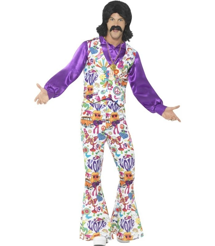 60s Groovy Hippie Costume, Multi-Coloured, with Waistcoat, Shirt & Flared Trousers, in Display Bag