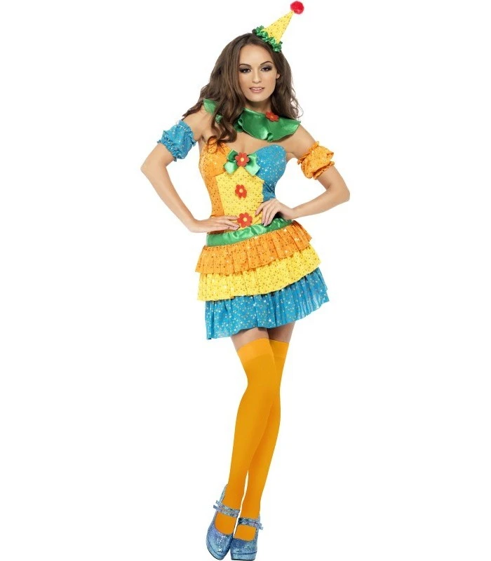 Colourful Clown Cutie Costume, Orange, with Sequin Dress, Neck Ruffle and Hat, in Display Bag
