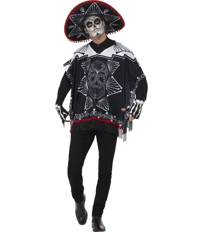 Day of the Dead Bandit Costume, Black & White, with Poncho, Sombrero & Gloves, in Display Bag