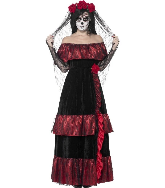 Day of the Dead Bride Costume, Black, with Dress & Rose Veil, in Display Bag