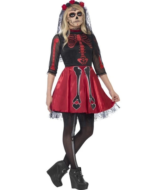 Day Of The Dead Diva Costume, Black, with Dress & Headpiece, in Display Bag