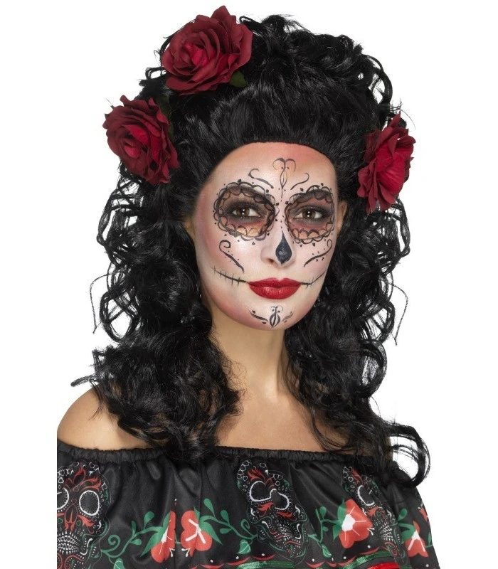 Deluxe Day of the Dead Wig, Black, with Roses, in Display Box