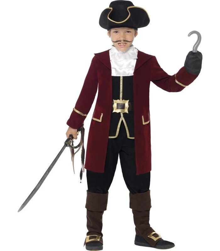 Deluxe Pirate Captain Costume, Black, Jacket, Mock Waistcoat, Trousers, Neck Scarf & Hat, in Display Bag