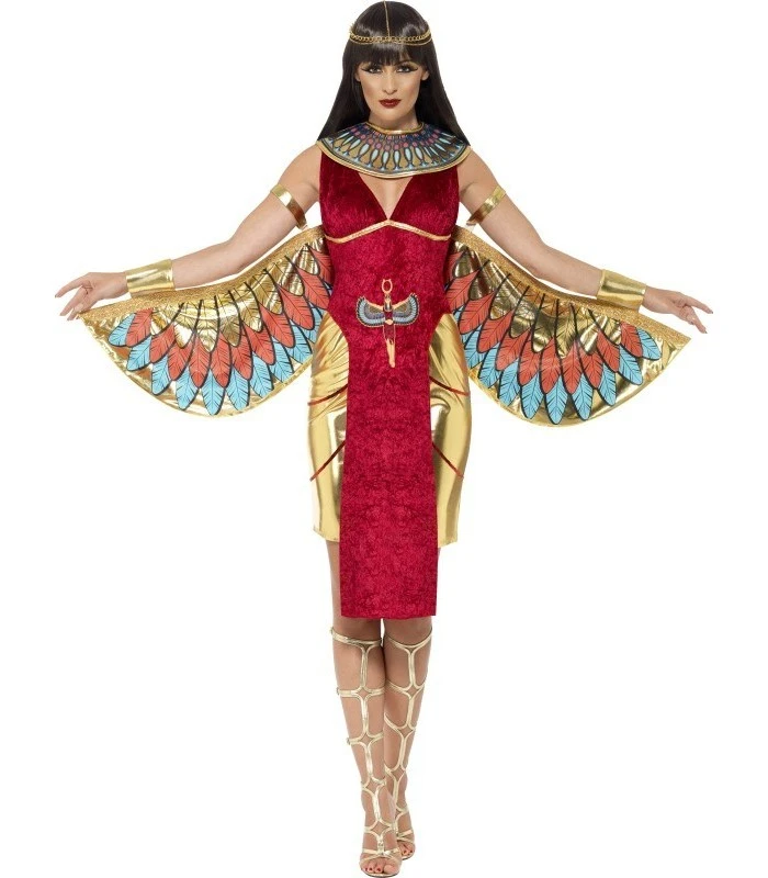 Egyptian Goddess Costume, Red, with Dress, Wings, Collar & Headpiece, in Display Bag