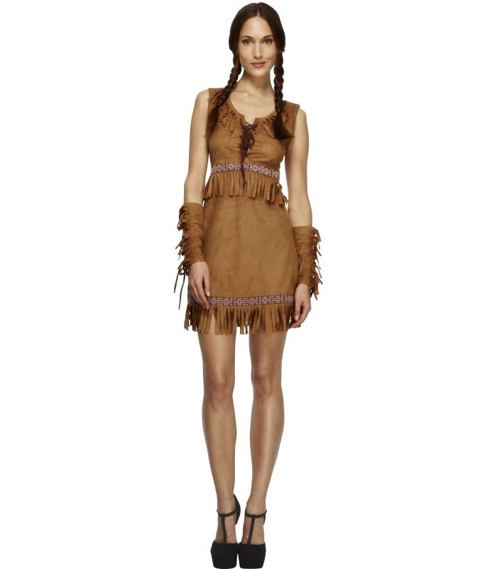 Fever Pocahontas Costume, Brown, with Dress and Arm Cuffs, in Display Bag