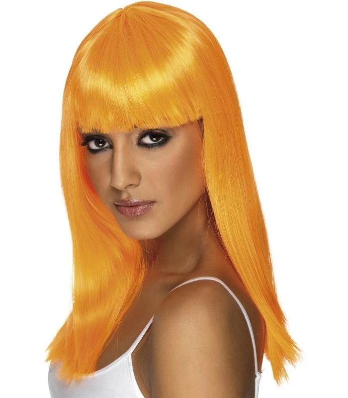 Glamourama Wig, Neon Orange, Long, Straight with Fringe, in Display Box