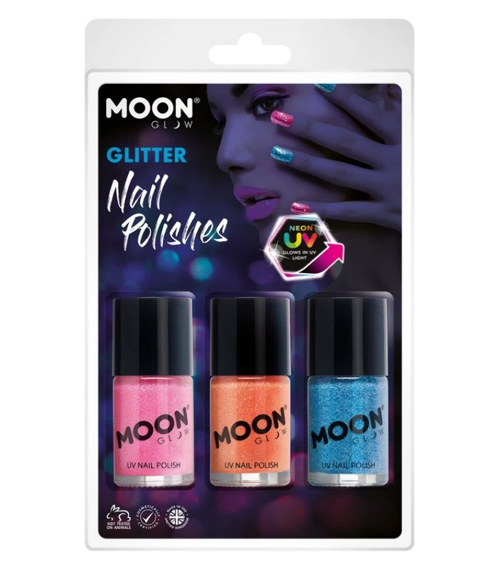Moon Glow – Neon UV Glitter Nail Polish, 14ml Clamshell – Hot Pink, Orange, Blue