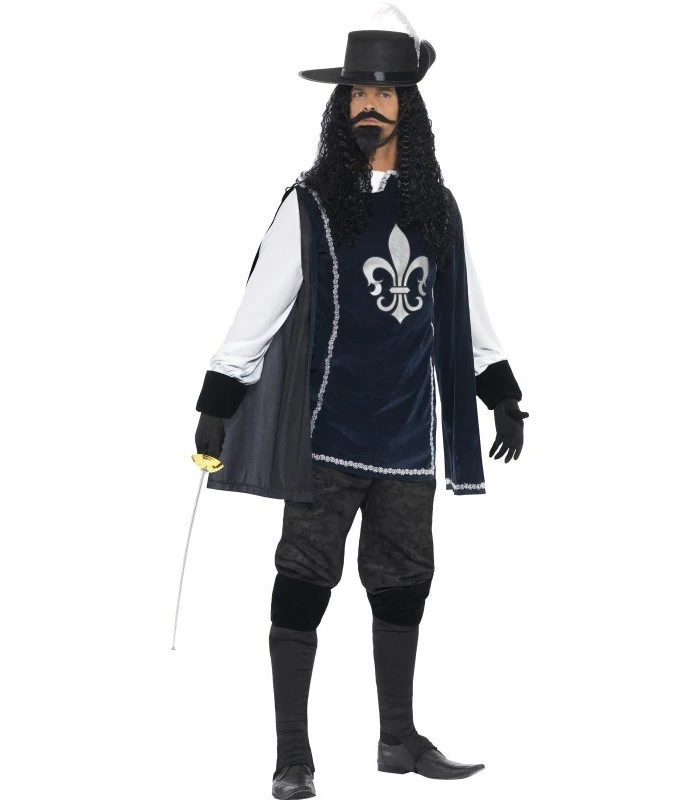 Musketeer Male Costume, Navy, with Top, Hat, Trousers, Gloves, Boot Covers, Beard & Tash, in Display Bag