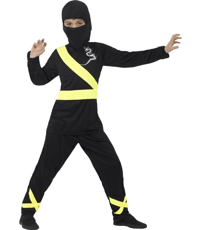 Ninja Assassin Costume, Black & Yellow, with Hood, Mask, Top & Trousers, in Display Bag