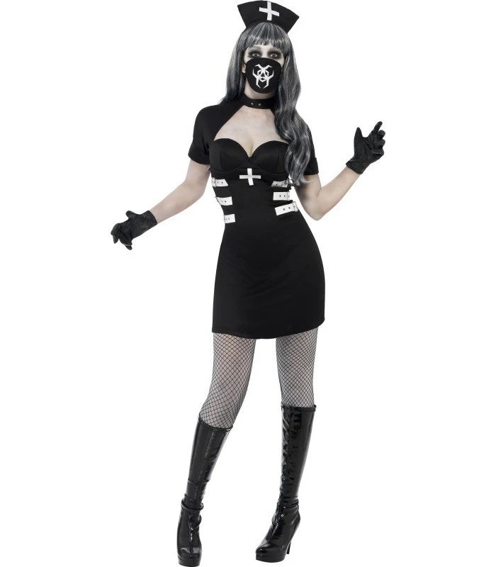 Nurse Delirium Costume, Black, with Dress, Jacket, Gloves, Headband & Mask, in Display Bag