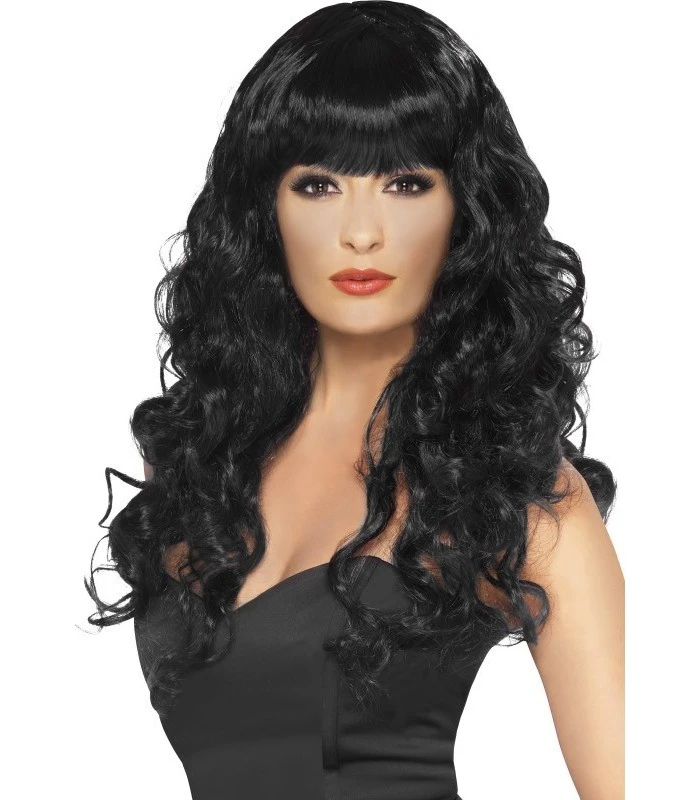 Siren Wig, Black, Long, Curly with Fringe, in Display Box