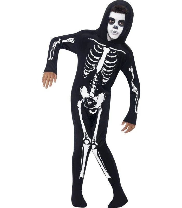 Skeleton Costume, Black, with Hooded All in One, in Display Bag