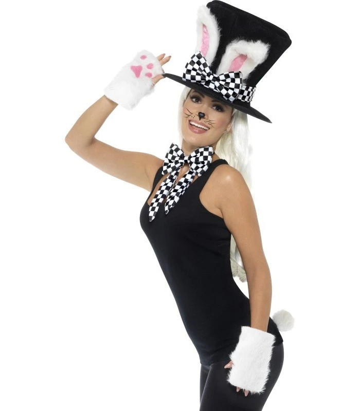 Tea Party March Hare Kit, Black & White, Top Hat, Rabbit Ears, Gloves, Bow Tie & Tail, in Display Bag
