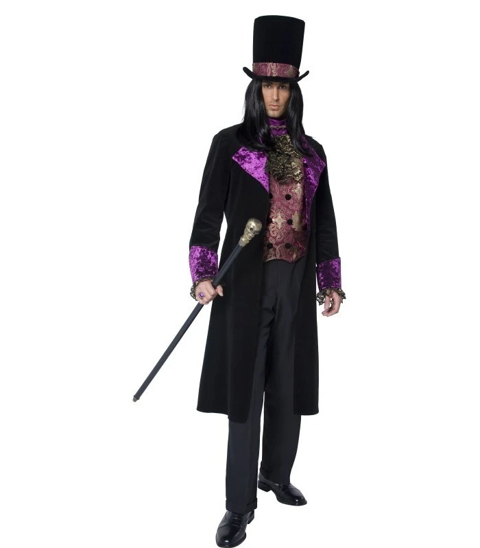 The Gothic Count Costume, Black, with Mock Waistcoat, Attached Cravat, Jacket & Hat, in Display Bag