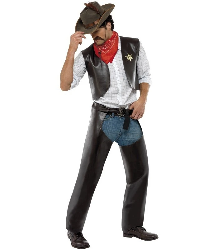 Village People Cowboy Costume, Black, with Vest, Chaps, Sheriff Badge & Bandana, in Display Bag