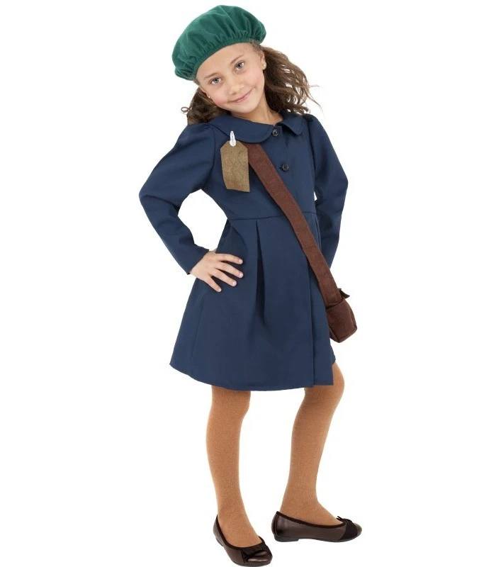 World War II Evacuee Girl Costume, Blue, with Dress, Hat and Bag, in Display Bag
