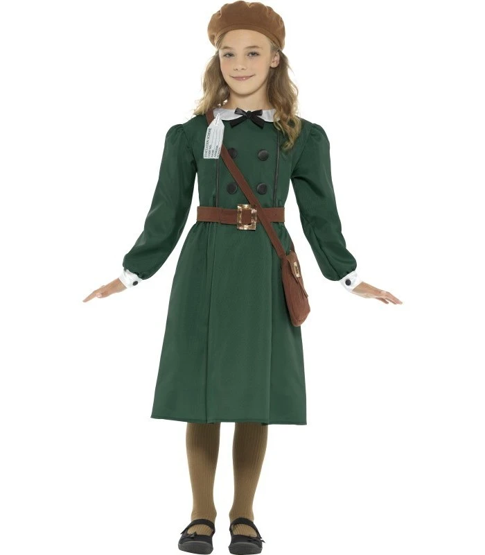 WW2 Evacuee Girl Costume, Green, with Dress, Hat, Bag & Name Tag, in Display Bag