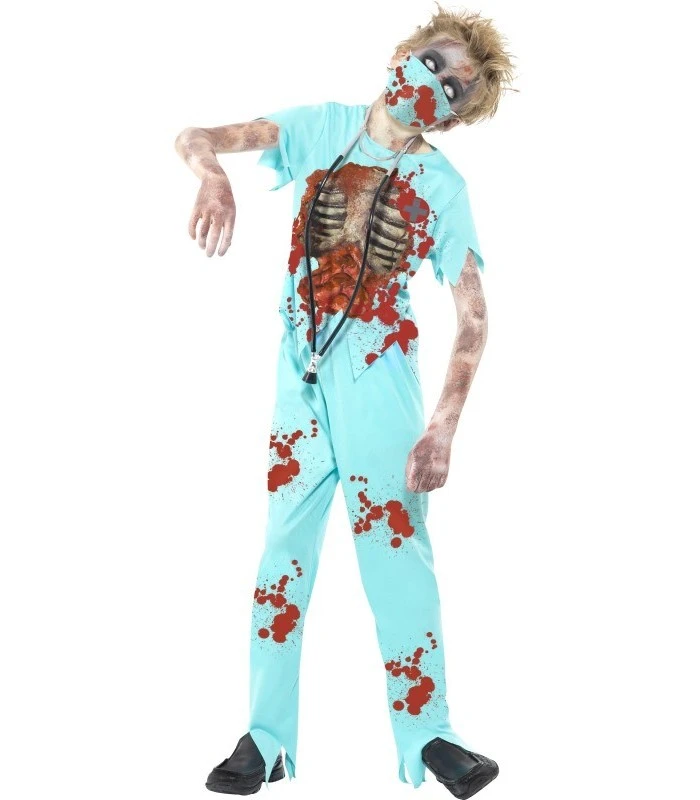 Zombie Surgeon Costume, Blue, with Bloodied Trousers, Top, Mask & Stethoscope, in Display Bag